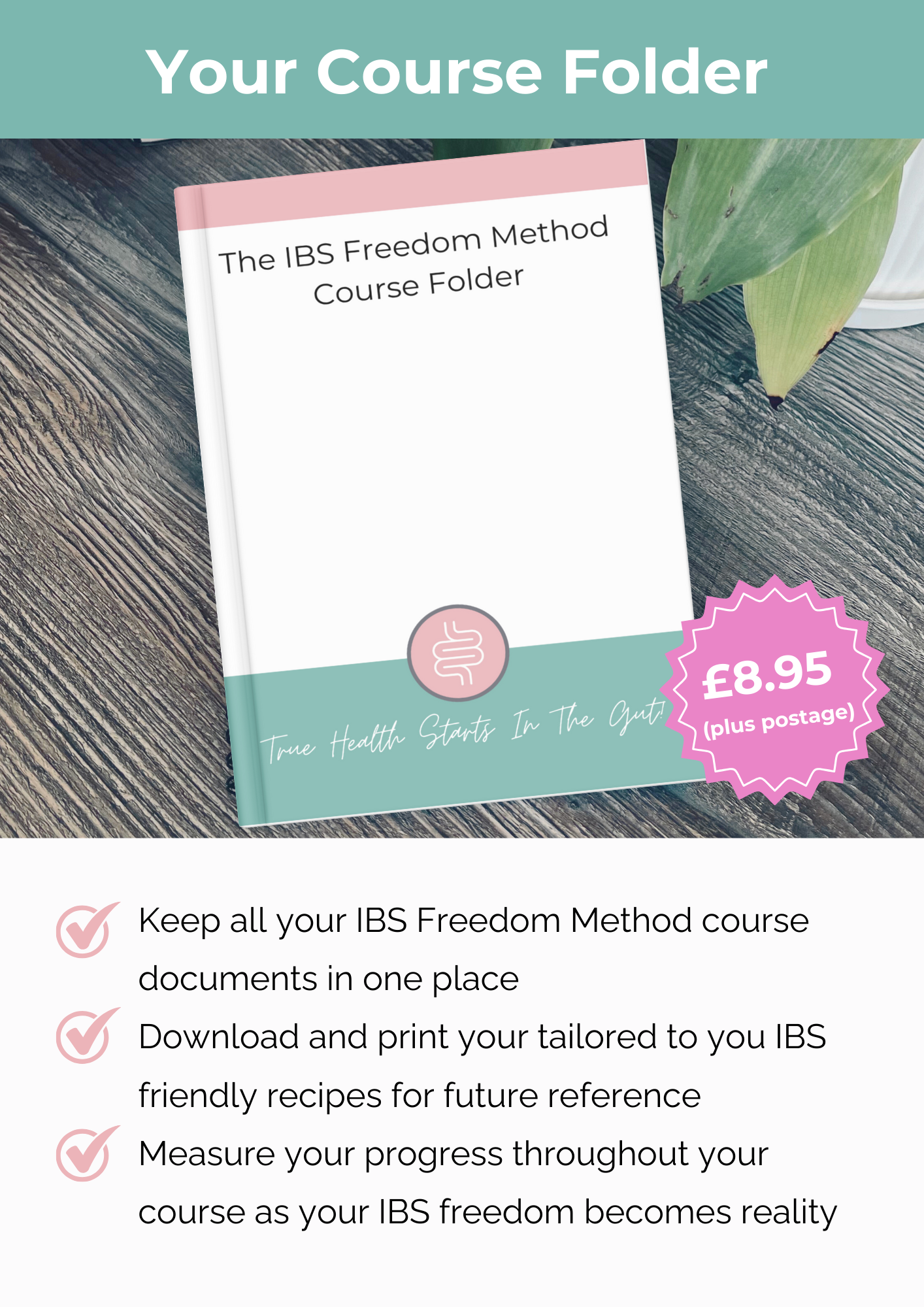 Due to popular request, I’ve created a stunning Coursework Folder for you. This will help you to keep all your papers together, such as your Dietary Analysis report, your Action Plan Worksheets, Accountability Coaching call info and of course your IBS Friendly Recipes together in one place.