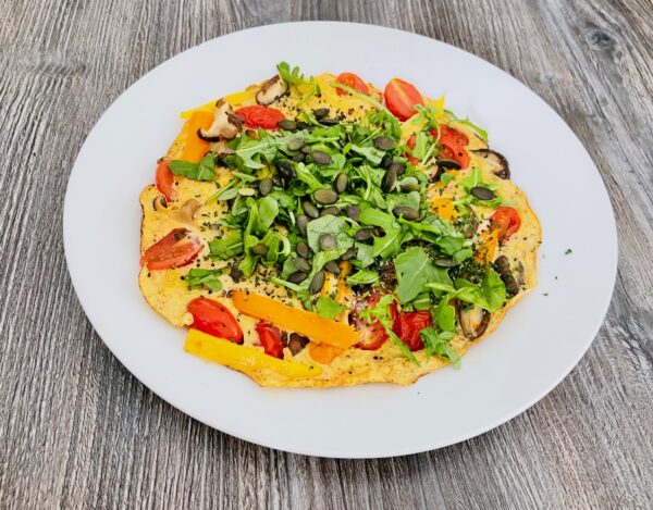 Orange bell pepper and cherry tomatoes add a burst of antioxidants and vitamin C to support immune function and reduce inflammation. Fresh spinach brings fibre, folate, and iron – perfect for feeding good gut bacteria and supporting energy levels, while pumpkin seeds add zinc and magnesium for digestion, hormone health, and a touch of crunch.