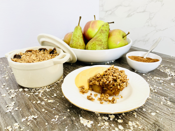 The apples and pears are of course filled with nutrition and I have opted to use coconut sugar as it contains more beneficial nutrition and an oat based crumble topping to keep the recipe gluten free also. Gluten affects around 80% of my IBS clients and therefore is in general best avoided.