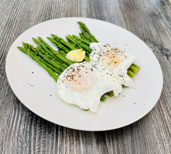 - Drain the asparagus and carefully scoop out your eggs to place on top. Add a dollop of butter and you are ready to go!