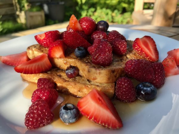 When the bread is golden and cooked through on both sides, serve on a plate, add the fruit, add the maple syrup and go and sit somewhere beautiful (in your garden if it is summertime) and enjoy this indulgent sweet breakfast treat.