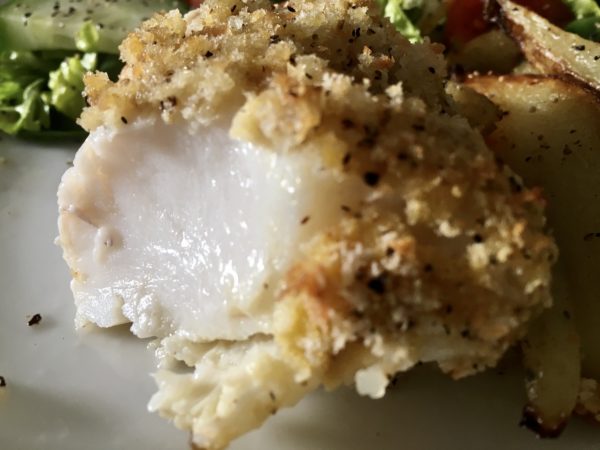 - Lightly spray the breaded cod (or chicken) with olive oil to hold it together whilst cooking and cook for 12 minutes, until cooked through. Serve with potatoes and greens and enjoy!