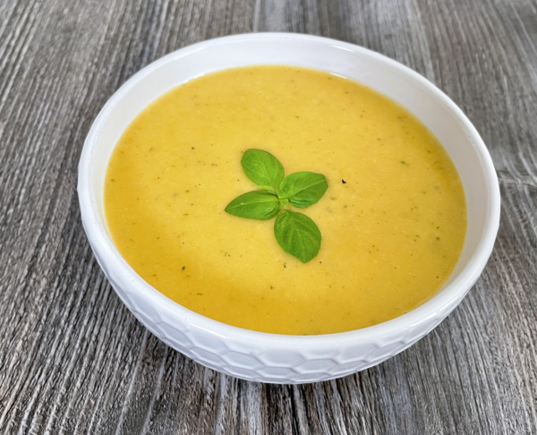 5. When all the veg is cooked through, blend and add the lemon juice. Then serve with a sprig of Basil and a dash of black pepper.