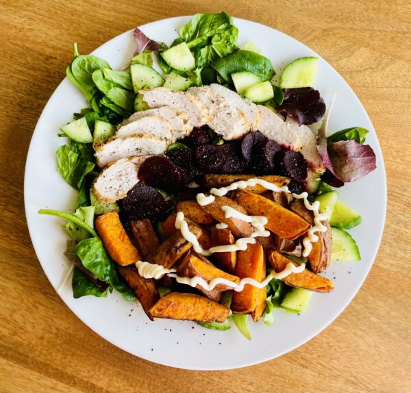 6. Add the sliced chicken breast, beet and wedges and add your dressing of choice and enjoy this hearty, filling salad with confidence.