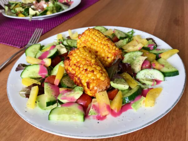 Salads should never be boring. This one was created out of a fridge with ‘nothing’ supposedly in… It actually only took around 10 – 12 minutes to create as I chopped the salad whilst cooking the corn.