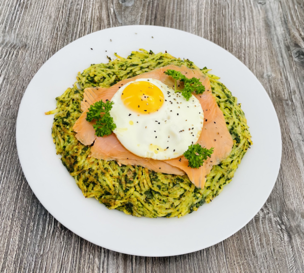 The homemade hash brown is given a nutritious twist with spinach mashed into the grated potato, adding a dose of magnesium, folate, and plant-based fibre to gently support regular bowel movements.