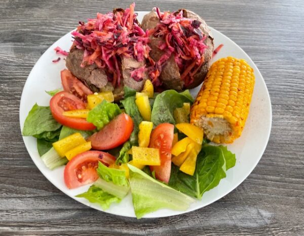 The humble jacket potato can be as exciting, colourful, tasty and filling as you want it to be. I love adding home made onion free slaw, salad and a spicy or buttery corn on the cob to go with it.