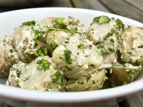Minty Potato Salad This side dish is one of my all time favourites. So easy to prepare and a great BBQ side dish. Amazing with a salad or protein item of your choice and handy to have in the fridge in case hunger takes over and you need a quick bite of something nutritious, green, fresh and tasty. Print Recipe Minty Potato Salad Course Sides Cuisine Gluten Free, Vegan Keyword IBS Friendly Recipe Prep Time 5 minutes Cook Time 15 minutes (optional) Passive Time 2 minutes Servings 4 people Ingredients 10 small New Potatoes (or 4 medium potatoes)1 large handfull Fresh Mint Chopped1 large handfull Fresh Parsley Chopped 2 tablespoons Mayonnaise (dairy free if required) ½ teaspoon Dijon Mustard (optional) Course Sides Cuisine Gluten Free, Vegan Keyword IBS Friendly Recipe Prep Time 5 minutes Cook Time 15 minutes (optional) Passive Time 2 minutes Servings 4 people Ingredients 10 small New Potatoes (or 4 medium potatoes)1 large handfull Fresh Mint Chopped1 large handfull Fresh Parsley Chopped 2 tablespoons Mayonnaise (dairy free if required) ½ teaspoon Dijon Mustard (optional) Instructions Wash and cut the potatoes into small 1 inch square shapes. Boil potatoes for 10 - 15 minutes, until tender. Drain and rinse the potatoes and wait until cool. Add the potatoes to a bowl, add the Mayo, Dijon and Freshly chopped herbs, stir and serve! Share this Recipe