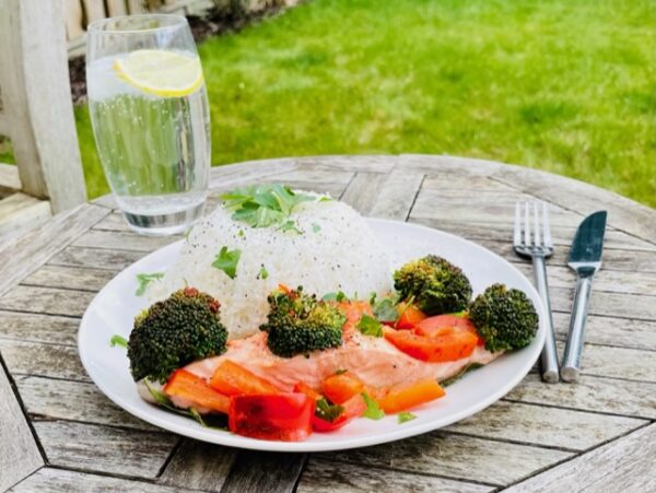 4. Whilst this is cooking, prepare the rice. I usually use ½ cup of rice with 1 cop of water. Bring to the boil in a saucepan and then simmer with a lid until cooked through (you can add salt but I don't to reduce bloating and water retention). Usually around 8 - 10 minutes depending on the brand of rice, brown, red and black rice take longer in which case you may want to start cooking the rice before you put the salmon in the oven.