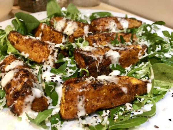 - drizzle your crem fraiche over the top and add grated vegan parmesan.