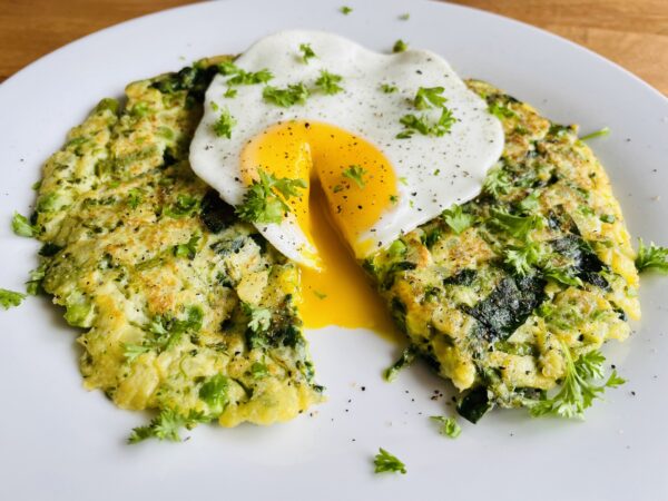 6. Add the egg on top of your bubble and squeak and garnish with fresh parsley.